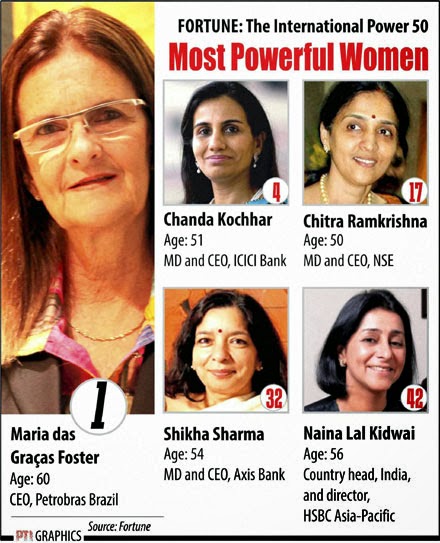നാഷണല് സ്റ്റോക്ക് എക്സ്ചേഞ്ച് (എന്.എസ്.ഇ.) അധ്യക്ഷ ചിത്രരാമകൃഷ്ണനാണ് പട്ടികയില് പതിനേഴാമത്. ആക്സിസ് ബാങ്ക് മേധാവി ശിഖാ ശര്മ 32-സ്ഥാനം നേടിയപ്പോള് എച്ച്.എസ്.ബി.സി. ബാങ്കിന്റെ ഇന്ത്യയുടെ ചുമതലയുള്ള നൈന ലാല് കിഡ്വാനി 42-ാമതെത്തി.